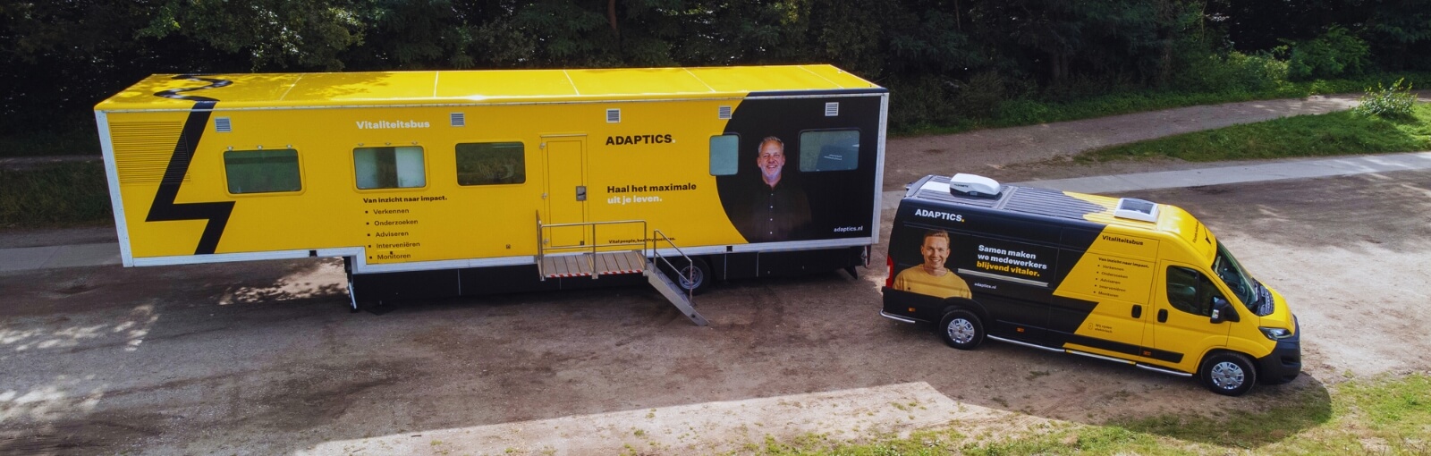 Ruim tien jaar geleden was Adaptics het eerste vitaliteitsbureau in Nederland met een Gezondheidsbus. Met deze bus reden we van organisatie naar organisatie voor het uitvoeren van  Preventief Medisch Onderzoek (PMO). Inmiddels hebben wij meerdere grote trailers én kleine bussen. We zetten de bus niet meer alleen in voor het PMO, maar ook voor het voeren van coachingsgesprekken. Deze bredere bestemming vroeg om een nieuwe naam. De Gezondheidsbus is omgedoopt naar: de Vitaliteitsbus.