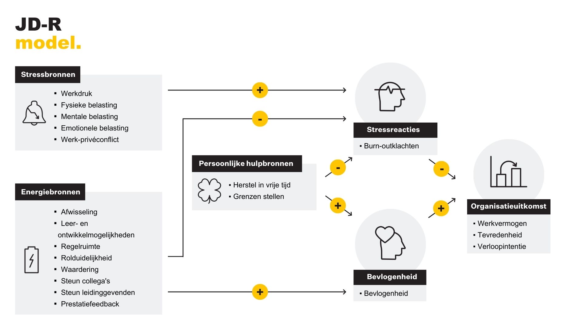 Het is aan de organisatie om de negatieve impact van de stressbronnen – de belastende werkeisen – te verminderen. Dat kan onder andere door het inzetten op de resources, weergegeven bij ‘energiebronnen’. Waar de stressbronnen druk en spanning kunnen veroorzaken bij de medewerker, bieden de energiebronnen een buffer en ondersteuning. Ter voorbeeld: de eerder genoemde emotionele belasting in de zorgsector is voor een medewerker beter te verhapstukken wanneer hij of zij steun van collega’s en leidinggevende ervaart. En de uitvoerende medewerker in de productieomgeving ervaart minder impact van de fysieke belasting wanneer hij of zij adequaat getraind wordt op de ergonomisch juiste werkmethodieken.